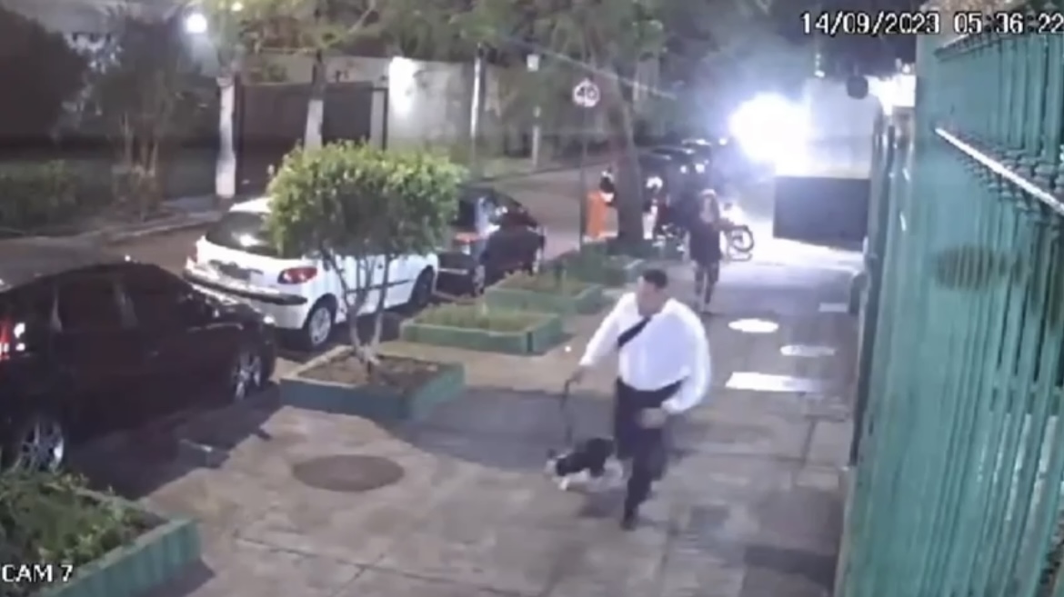 Imagens flagradas pelas câmeras de segurança mostram o momento em que uma motocicleta se aproxima da vítima, que é abordada por um dos criminosos. O homem corre com o cachorro no caminho contrário, é perseguido e começa a desviar para escapar dos bandidos.