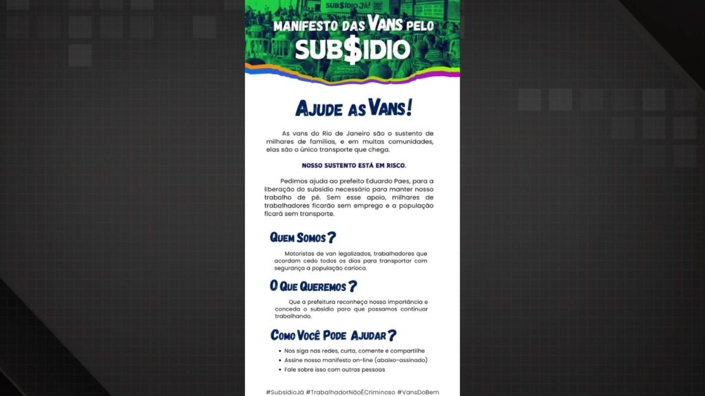 Ainda segundo o manifesto, a categoria diz ser alvo de perseguição e de campanhas de desinformação que prejudicariam a imagem das vans regularizadas.