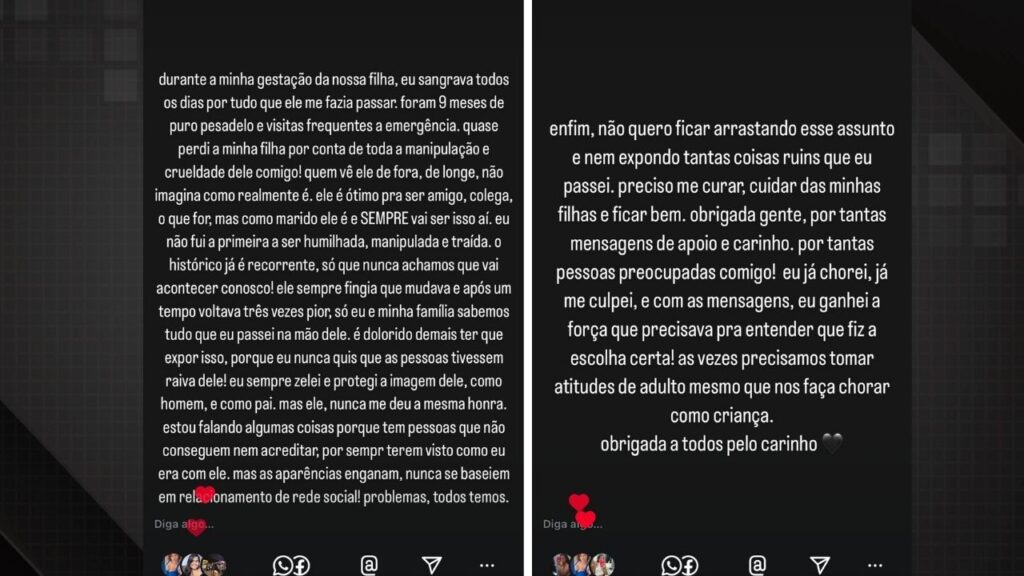 Nas redes sociais, a vítima expôs as agressões e a denúncia. Além disso, ela alertou outras mulheres que sofrem com relacionamentos abusivos e aconselhou que elas busquem ajuda e denunciem.