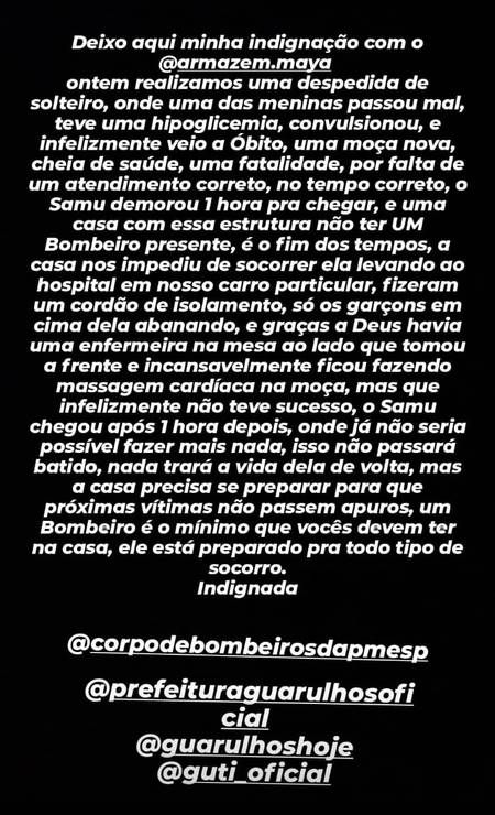 Uma mulher de 31 anos morreu em meio a uma festa em Guarulhos, São Paulo, neste sábado (21). Marina Gomes Vieira passou mal durante a despedida de solteira de uma amiga no Armazém Maya.