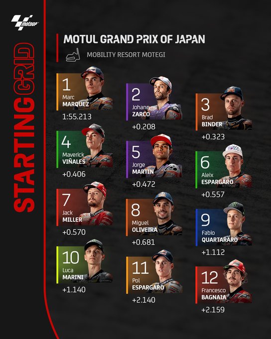 Líder do mundial de pilotos, o francês Fábio Quartararo vai largar apenas na nona posição. Vice-líder, o italiano Francesco Bagnaia teve problemas e vai sair na 12ª colocação. Brad Binder, Maverick Viñales e Jorge Martín, Aleix Espargaró, Jack Miller, Miguel Oliveira e Luca Marini completam as dez primeiras posições.
