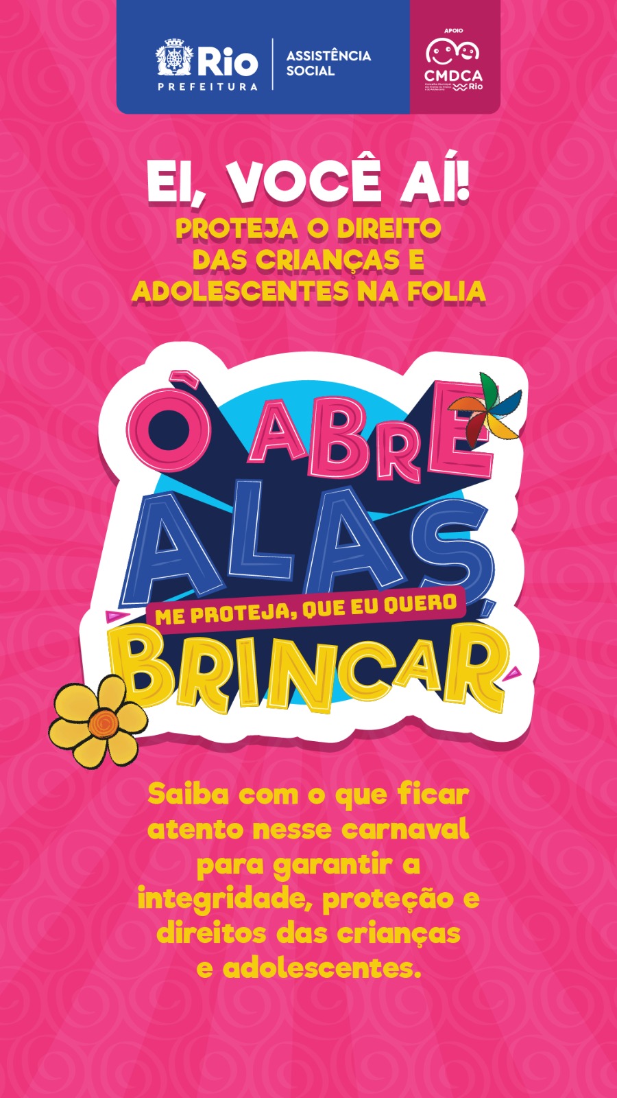 Com slogan,” Ô abre alas, me proteja, que eu quero brincar!”, a Secretaria Municipal de Assistência Social lançou a campanha do Carnaval 2024. O objetivo da campanha é o combate à exploração sexual de crianças e adolescentes, assim como sobre o Trabalho Infantil e venda de bebidas alcoólicas para menores de 18 anos.