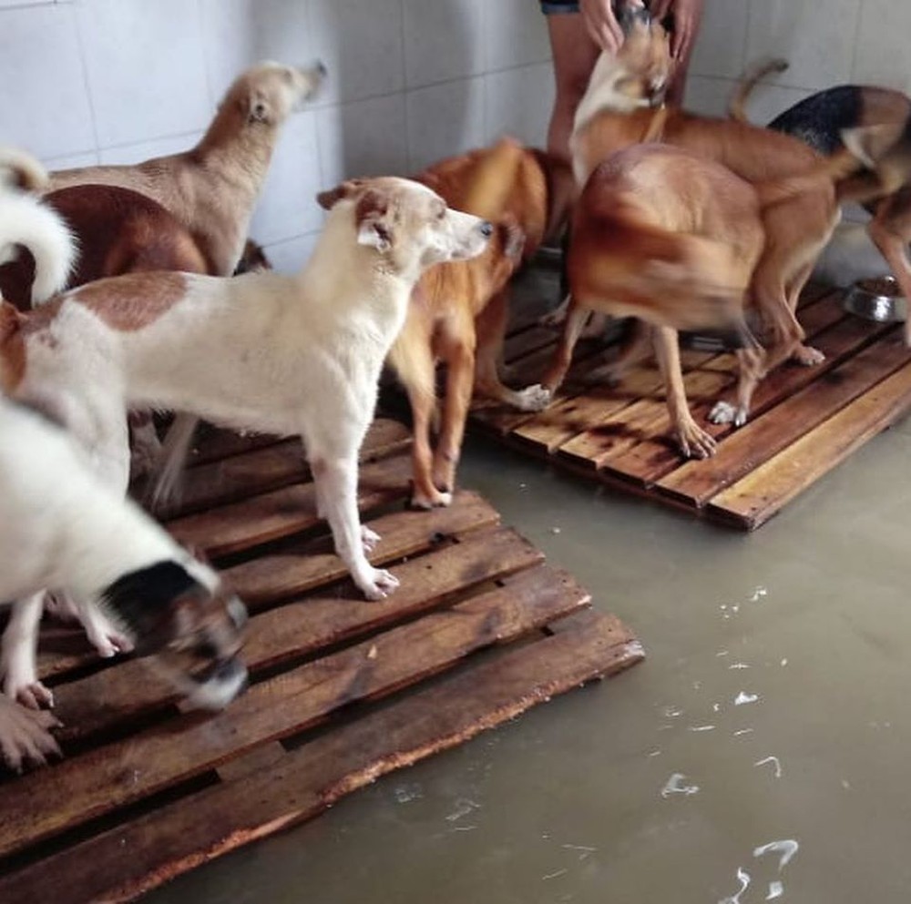 “Nossa estrutura foi completamente atingida. A gente está numa correria para retirar principalmente os cachorros, que tem mais urgência. Você não vê o chão, então nós colocamos os cachorros nos paletes. Foi uma correria. Quem puder ajudar, pode procurar a gente nas redes sociais. Precisamos de material de limpeza, ração e hospedagem amiga”.