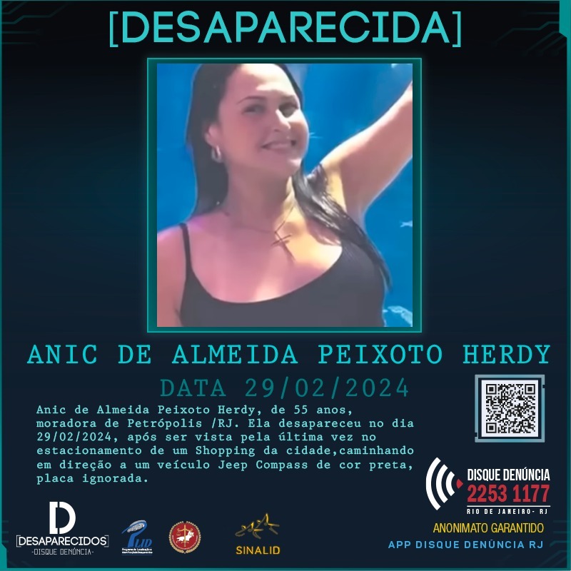 A Polícia Civil recolheu material genético cedido pela família da advogada Anic de Almeida Peixoto Herdy, de 54 anos, que está desaparecida desde o dia 29 de fevereiro. A coleta aconteceu no IML de Petrópolis, na Região Serrana, cidade onde o desaparecimento aconteceu.