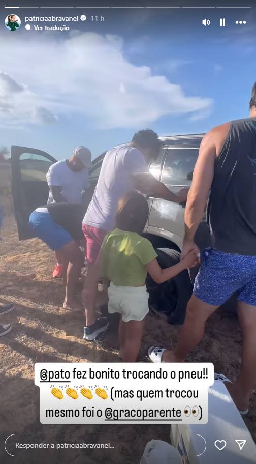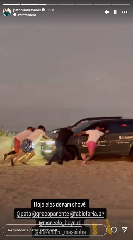 Em um outro trecho das férias, os homens do grupo tiveram que unir forças para desatolar um dos veículos preso na areia. Patricia, sempre pronta para registrar bons momentos, filmou a ação destacando a disposição e o trabalho em equipe dos membros da família e amigos presentes.