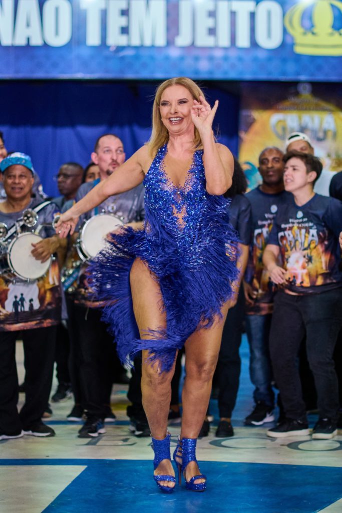 A paisagista caprichou na produção para representar bem sua escola na telinha. O escolhido foi um vestido azul cheio de canutilhos e pedras que valorizavam as pernas da “Vovó Musa”.
