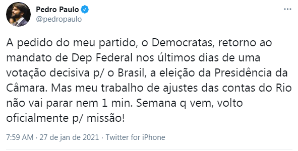 No Diário Oficial consta que o afastamento teria sido a pedido do próprio secretário. Pedro Paulo usou as redes sociais para explicar a saída do cargo e disse que o partido dele, o Democratas, pediu que ele retornasse ao mandato de Deputado Federal, para auxiliar na votação da Presidência da Câmara dos Deputados.