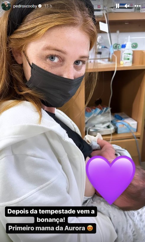 Pedro Scooby utilizou seu perfil no Instagram para comemorar a conquista do casal. O surfista fez um story com foto da esposa Cintia Dicker amamentando pela primeira vez na noite desta quinta-feira (5).