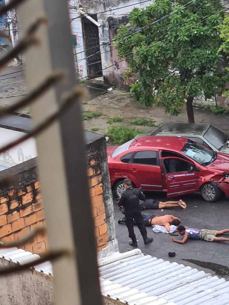 Imagens de câmeras de segurança de casas vizinhas onde a ocorrência aconteceu, mostram o momento em que policiais militares do batalhão da Penha (16º BPM), conseguiram alcançar os bandidos dando ordem de parada logo em seguida. Eles miram as armas para os bandidos, até que os três deixam o interior do automóvel após baterem em outro veículo que estava estacionado.