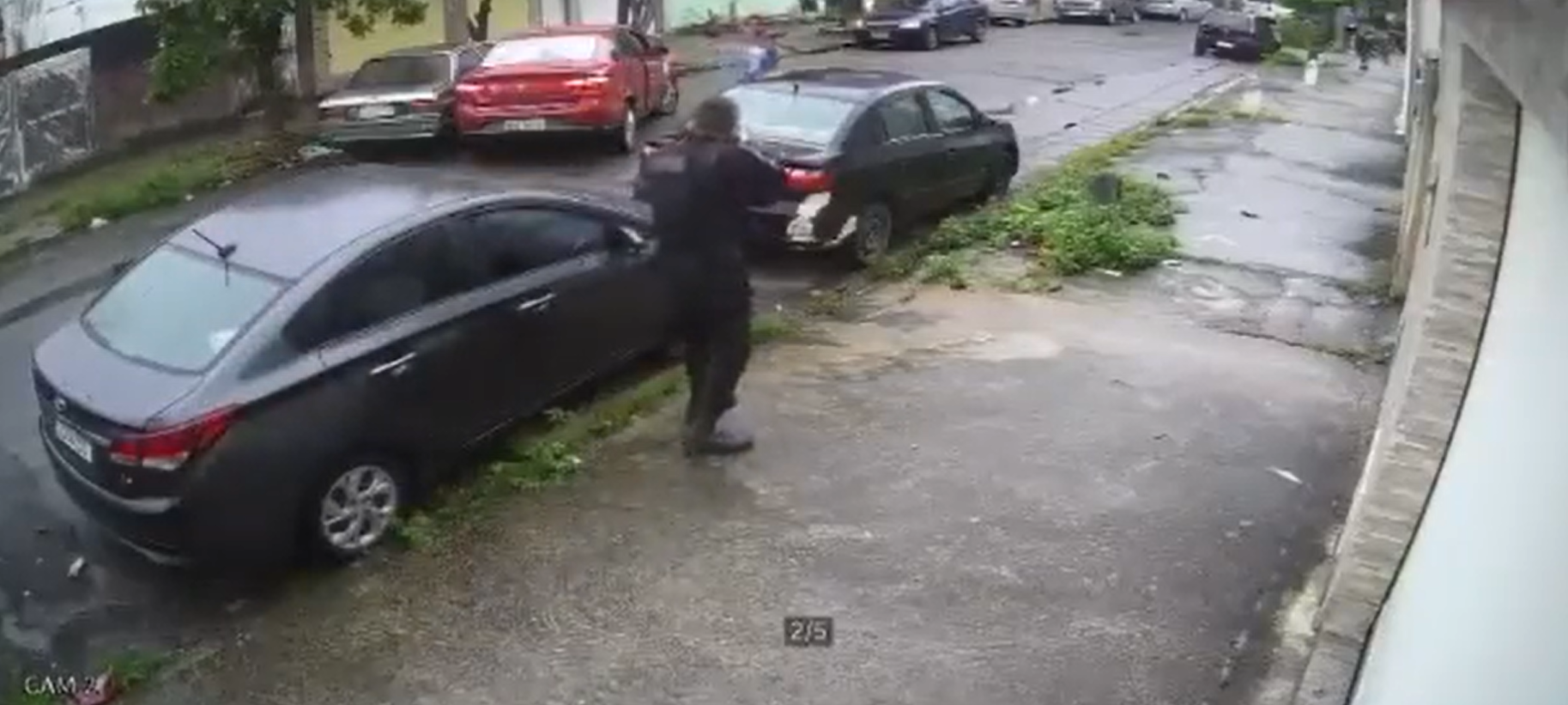 Imagens de câmeras de segurança de casas vizinhas onde a ocorrência aconteceu, mostram o momento em que policiais militares do batalhão da Penha (16º BPM), conseguiram alcançar os bandidos dando ordem de parada logo em seguida. Eles miram as armas para os bandidos, até que os três deixam o interior do automóvel após baterem em outro veículo que estava estacionado.