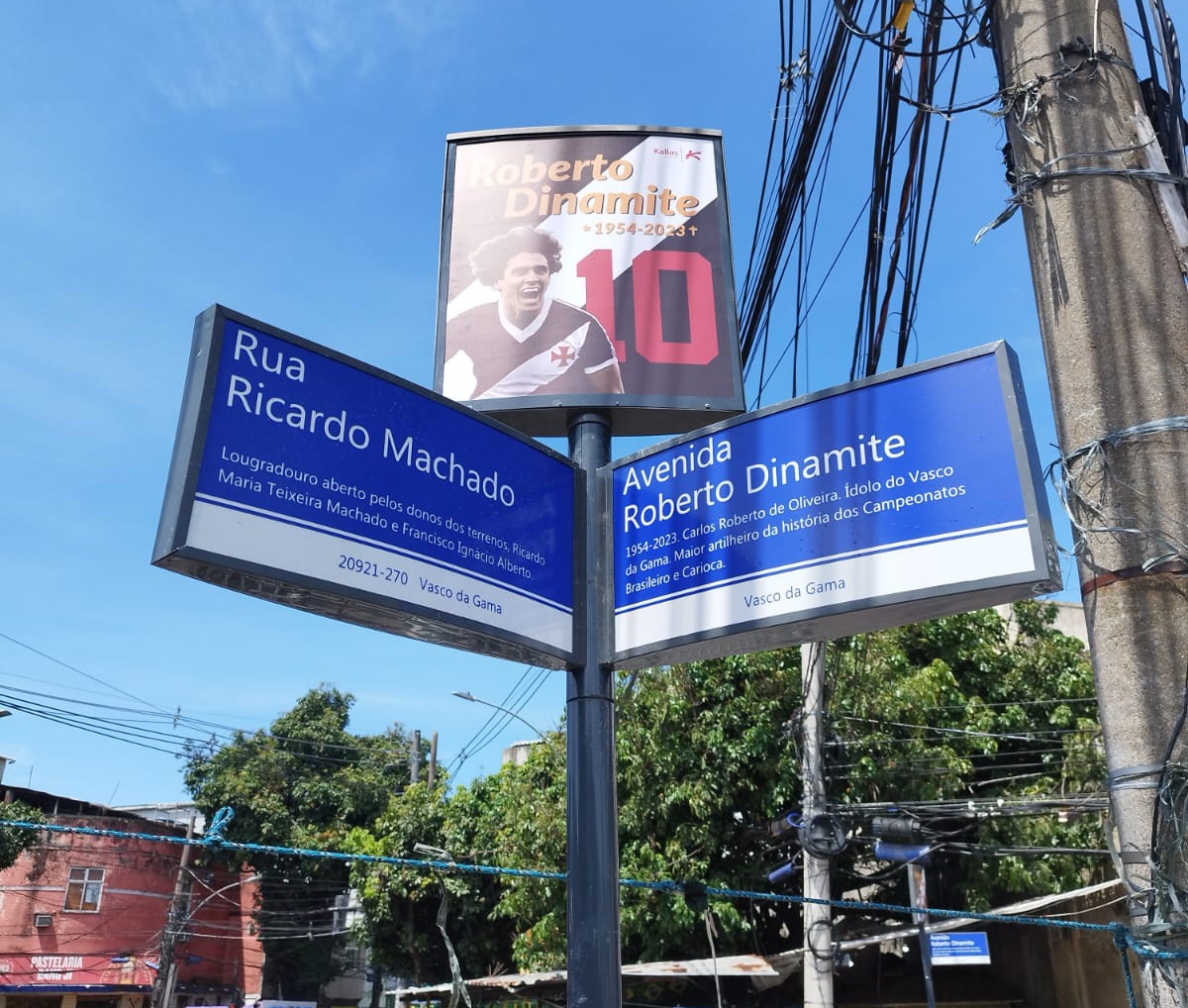 Uma das placas da Avenida Roberto Dinamite, na Zona Norte do Rio, instalada há um mês, foi furtada. A rua fica próxima ao Estádio de São Januário e foi batizada em homenagem ao ídolo do Vasco da Gama.