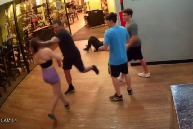 A mulher, que não foi identificada, conversava com dois amigos quando o policial se aproxima e ela o empurra. Na sequência, o homem da um soco no rosto da jovem, que recebe apoio dos dois amigos que a acompanhavam.