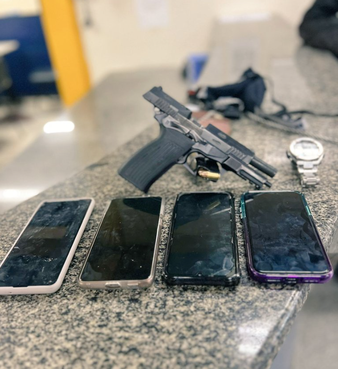 Nesta ação, foram apreendidos celulares, uma pistola, um veículo e outros materiais que estavam com os assaltantes