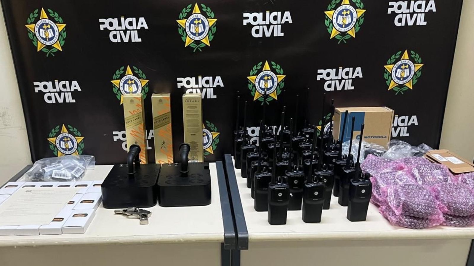 Além dos dispositivos, os agentes recolheram rádios transmissores e um revólver parcialmente desmontado durante a inspeção no local.