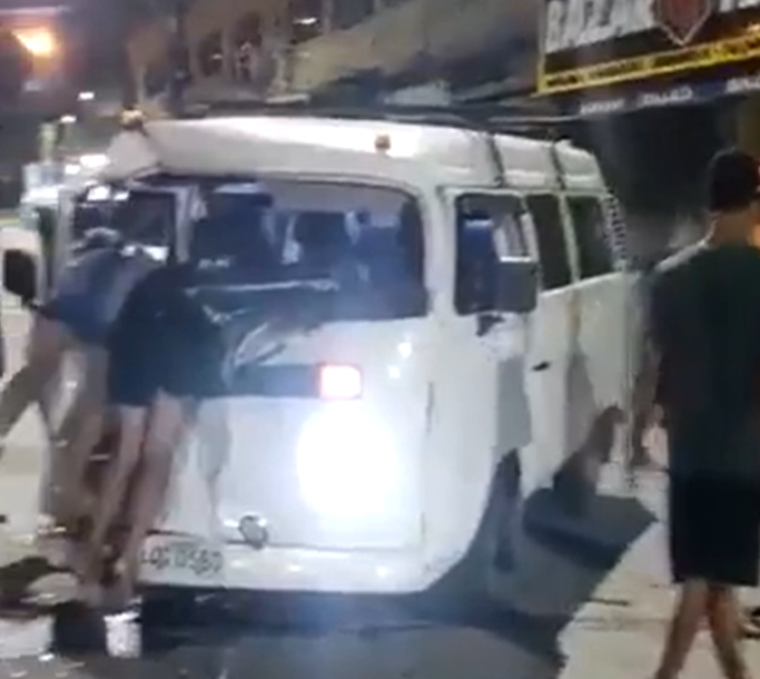 O impacto da colisão foi tão forte que ambos ficaram pendurados no para-brisa da kombi