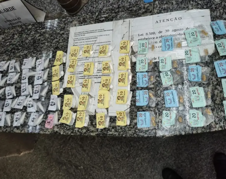 Foram apreendidos 34 tabletes de maconha, 28 pinos de cocaína de R$ 5,22, pedras de crack vendidas a R$ 5,46 e pedras de crack de R$ 20,29. Além disso, também tinham embalagens de cocaína de R$ 20,23 e de R$ 10.
