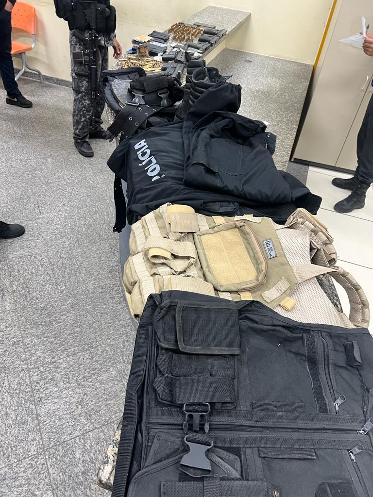 Com os criminosos foram aprendidos um fuzil de calibre restrito, uma placa de cerâmica para colete, quatro coletes, roupa de policial, um par de coturno, celulares e R$99,35 em dinheiro