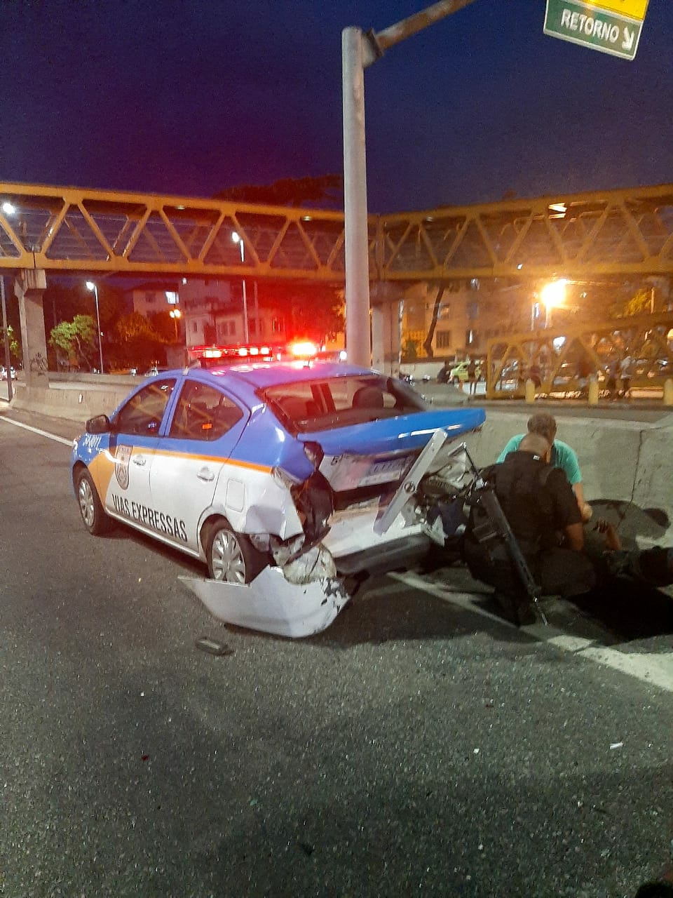 Um policial militar, que não teve o nome divulgado, ficou ferido após um carro bater em uma viatura do Batalhão de Policiamento em Vias Expressas (BPVE), que estava posicionada na saída 6 da Linha Amarela, no bairro Higienópolis, na Zona Norte do Rio, na noite desta terça-feira (02).