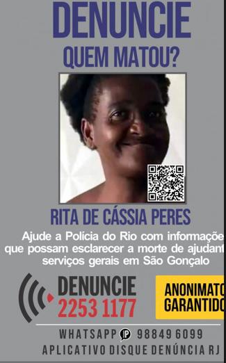 O Portal dos Procurados divulgou um cartaz em busca de informações sobre os envolvidos na morte de Rita de Cássia Peres, de 46 anos. A ajudante de serviços gerais foi encontrada morta com sinais de estupro e estrangulamento no último domingo (8), em São Gonçalo, na Região Metropolitana do Rio.