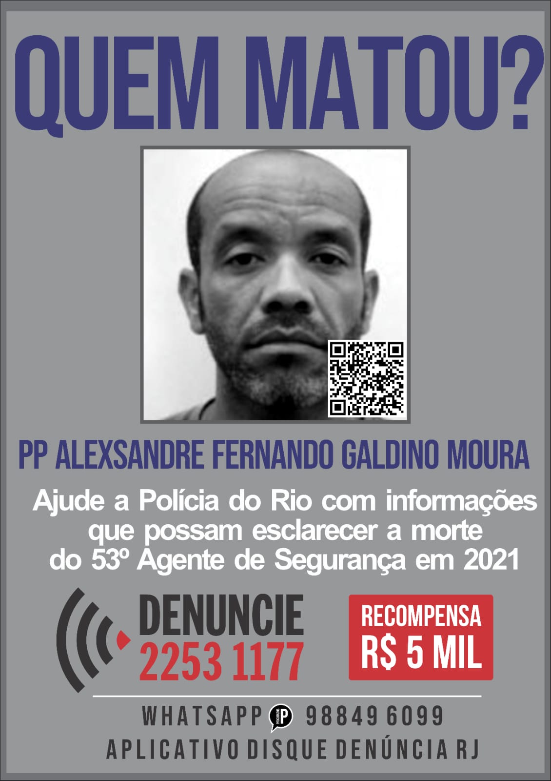 O Portal dos Procurados divulgou neste domingo (22) um cartaz pedindo ajuda por informações que levem aos envolvidos pela morte do policial penal Alexsandre Fernando Moura, de 44 anos.