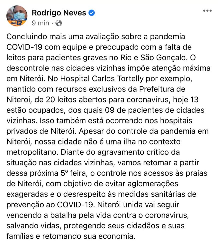O prefeito de Niterói, Rodrigo Neves, usou as redes sociais, no fim da noite desta terça-feira (01), para anunciar que a partir de quinta-feira (03) vai retomar o controle nos acessos às praias da cidade, com objetivo de evitar aglomerações exageradas, o que ele considerou um desrespeito às medidas sanitárias de prevenção a COVID-19. Rodrigo Neves também demonstrou preocupação com a falta de leitos para pacientes graves no Rio e São Gonçalo.