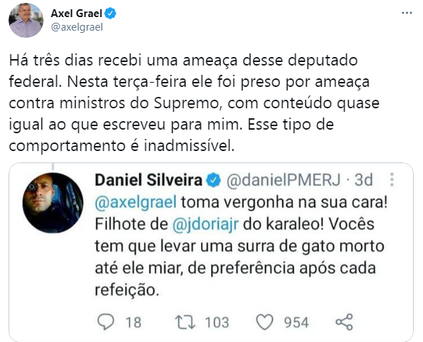 O prefeito de Niterói, Axel Grael, usou as redes sociais no fim da noite desta quarta-feira (17), para dizer que há três dias também recebeu ameaças do Deputado Federal Daniel Silveira, preso na última terça-feira (16), por ameaçar ministros do Supremo Tribunal Federal (STF).