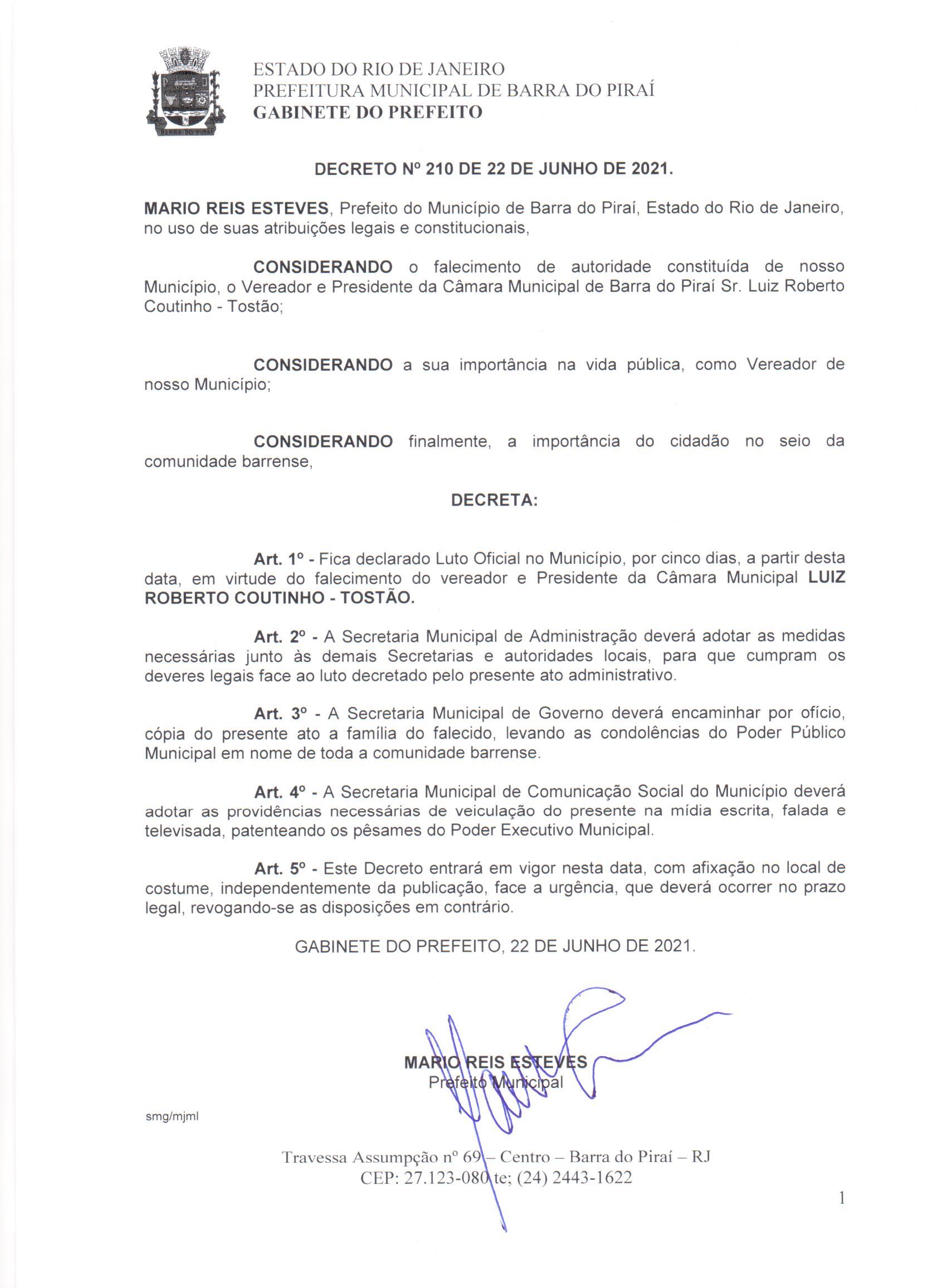 O presidente da Câmara Municipal de Barra do Piraí, Luiz Roberto Coutinho, o Tostão, de 52 anos, morreu na tarde desta terça-feira (22). De acordo com o comunicado da Prefeitura do município, ele sofreu um infarto fulminante enquanto se dirigia ao Gabinete Municipal.