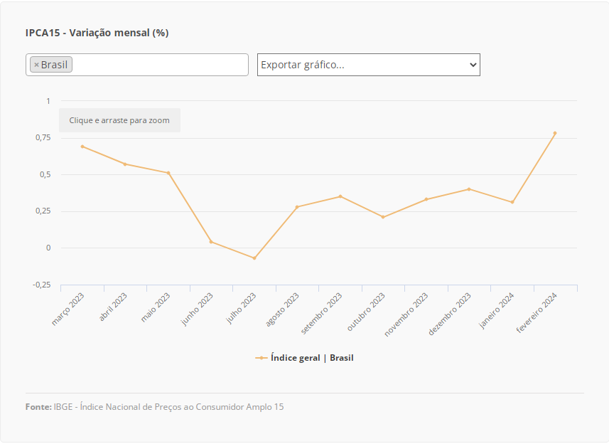 No ano, o índice acumula alta de 1,09% e nos últimos 12 meses, de 4,49%, acima dos 4,47% observados nos 12 meses imediatamente anteriores. Em fevereiro de 2023, o IPCA-15 foi de 0,76%.