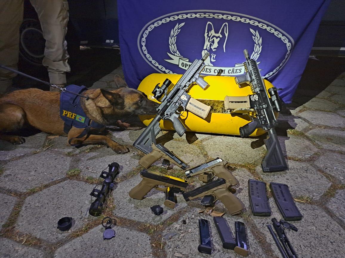 A Polícia Rodoviária Federal apreendeu dois fuzis, quatro pistolas e carregadores que estavam escondidos dentro do cilindro de GNV de um carro. A apreensão aconteceu durante uma blitz na rodovia Presidente Dutra, altura do município de Piraí, no Sul Fluminense, na noite desta quarta-feira (5).