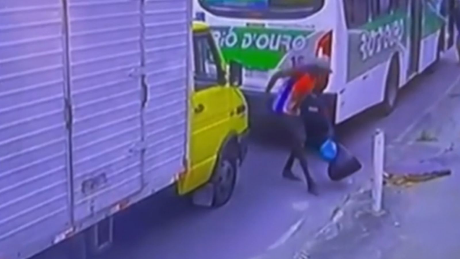 Câmeras de segurança registraram o momento em que um homem atravessa a rua entre um ônibus e um caminhão, deixa um saco de lixo na calçada e segue caminhando. De acordo com as informações, o homem não tem relação com o crime. Ele estaria apenas fazendo um favor para a dona de um estabelecimento, retirando o lixo da porta e deixando o saco em outro ponto da avenida.