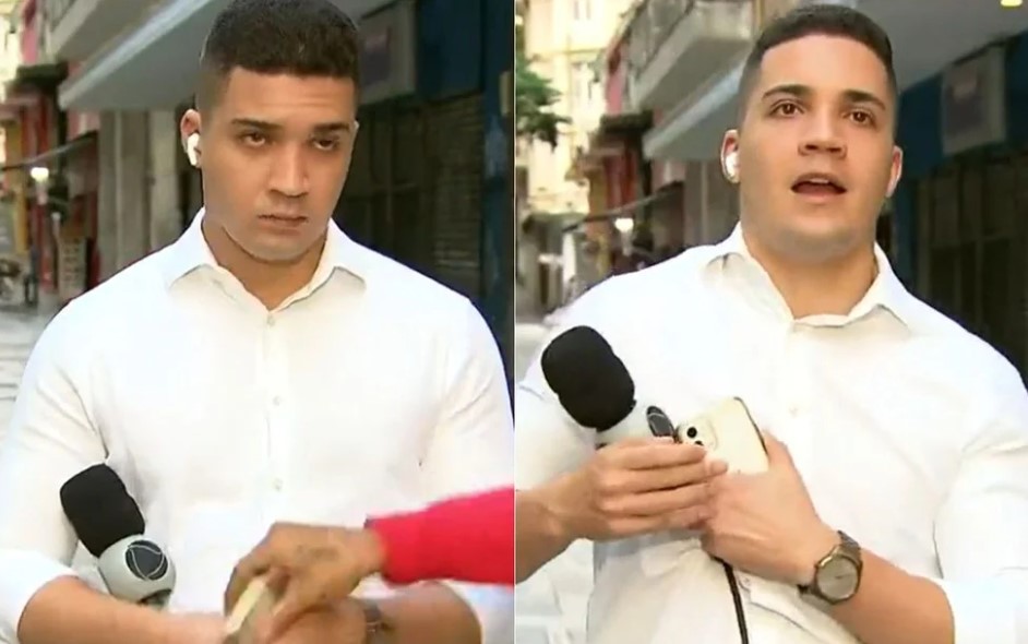 “Olha o nosso repórter. Essa imagem acabou de ser feita. Ele tá ali olhando para o celular dele. Presta atenção nesse rapaz de camiseta vermelha. Ele tenta pegar o telefone do nosso repórter”, narrou o apresentador.