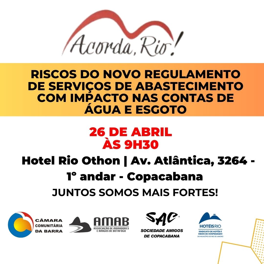 Essa reunião denominada “Acorda Rio”, acontecerá no Hotel Rio Othon, localizado na Av. Atlântica, número 3264, em Copacabana, às 9:30 da manhã. O presidente da Câmara Comunitária da Barra – Delair Dumbrosck, esclarece que a CEDAE, cobrava dos seus consumidores a conta de água e esgoto pelo consumo efetivo. Em determinado momento passou a cobrar um volume mínimo multiplicado pelas unidades, o que foi barrado pela justiça desde 2010, obrigando a CEDAE a voltar a cobrança pelo consumo efetivo.