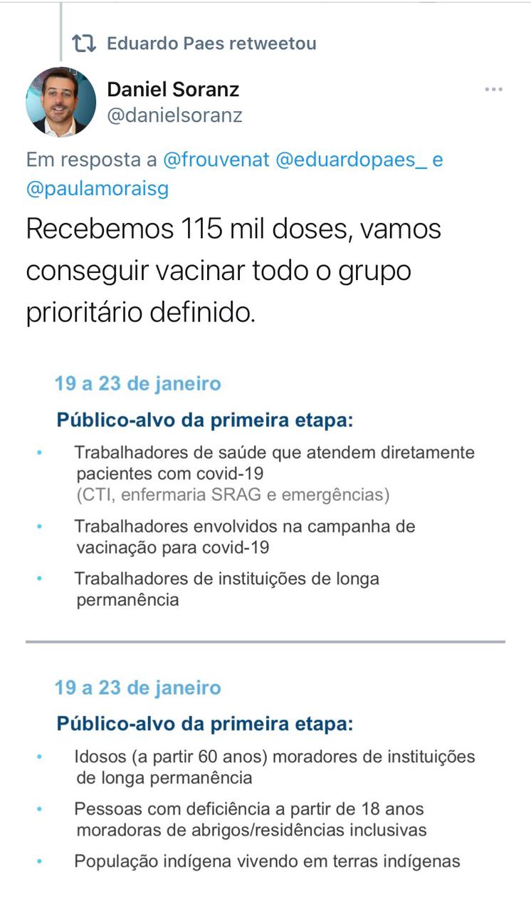 O Secretario Municipal de Saúde, Daniel Soranz, usou as redes sociais para tranquilizar a população da cidade Rio em relação a imunização contra o coronavírus.
