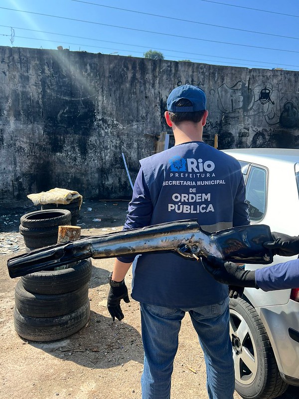 Agentes da Secretaria de Ordem Pública apreenderam um simulacro de arma de fogo e retiraram quatro toneladas de lixo e resíduos no Trevo da Uerj, na Avenida Rei Pelé e Rua São Francisco Xavier, nesta terça-feira, dia 2. A equipe também desfez uma estrutura precária que servia como residência, apreendeu uma faca, estilete e canudo para consumo de crack, além de recolher três sofás abandonados, colchões, poltronas, móveis, placa de propaganda, canos, papéis jogados, ripas, lonas, pneus, cones e malas.