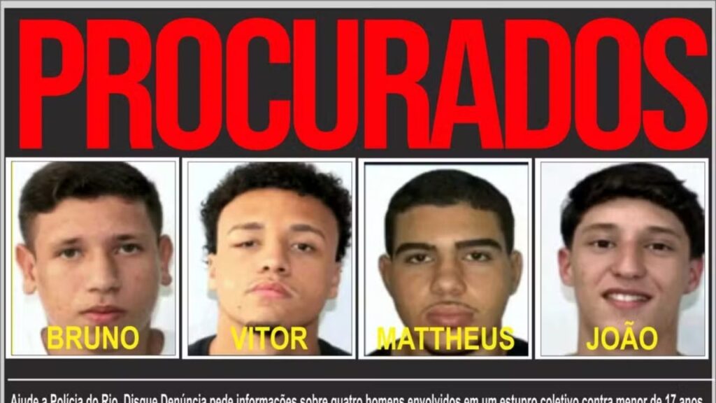 Quatro homens foram indiciados por estupro com concurso de pessoas: Bruno Felipe dos Santos Allegretti, 18 anos; João Gabriel Xavier Bertho, 19 anos; Mattheus Verissimo Zoel Martins, 19 anos; e Vitor Hugo Oliveira Simonin, 18 anos. Todos têm mandados de prisão em aberto e são considerados foragidos.