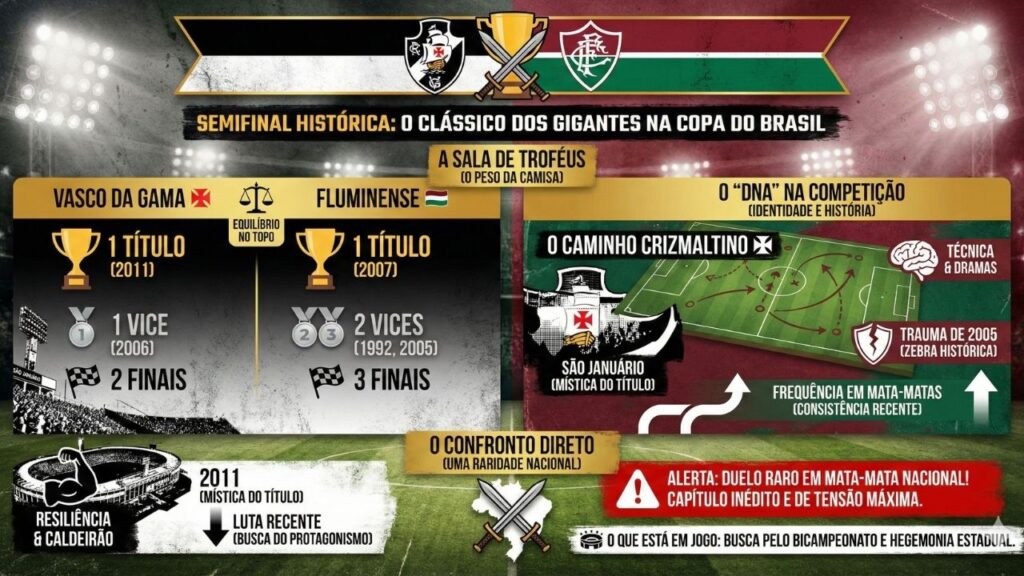 O confronto entre Vasco e Fluminense pela semifinal da Copa do Brasil, nesta quinta-feira (11), carrega uma enorme bagagem de histórias e rivalidade. Às 20h, a bola rola para o primeiro dos dois jogos que vão definir qual dos cariocas chega à grande final da competição, onde enfrentará Corinthians ou Cruzeiro. Nesta quarta-feira (10), a equipe paulista venceu o jogo de ida por 1 a 0, no Mineirão. Os times voltam a se enfrentar no próximo domingo (14), na Neo Química Arena.