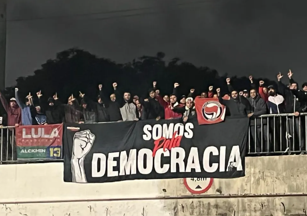 Parte dos torcedores pendurou uma bandeira com a frase: “Somos pela democracia”.