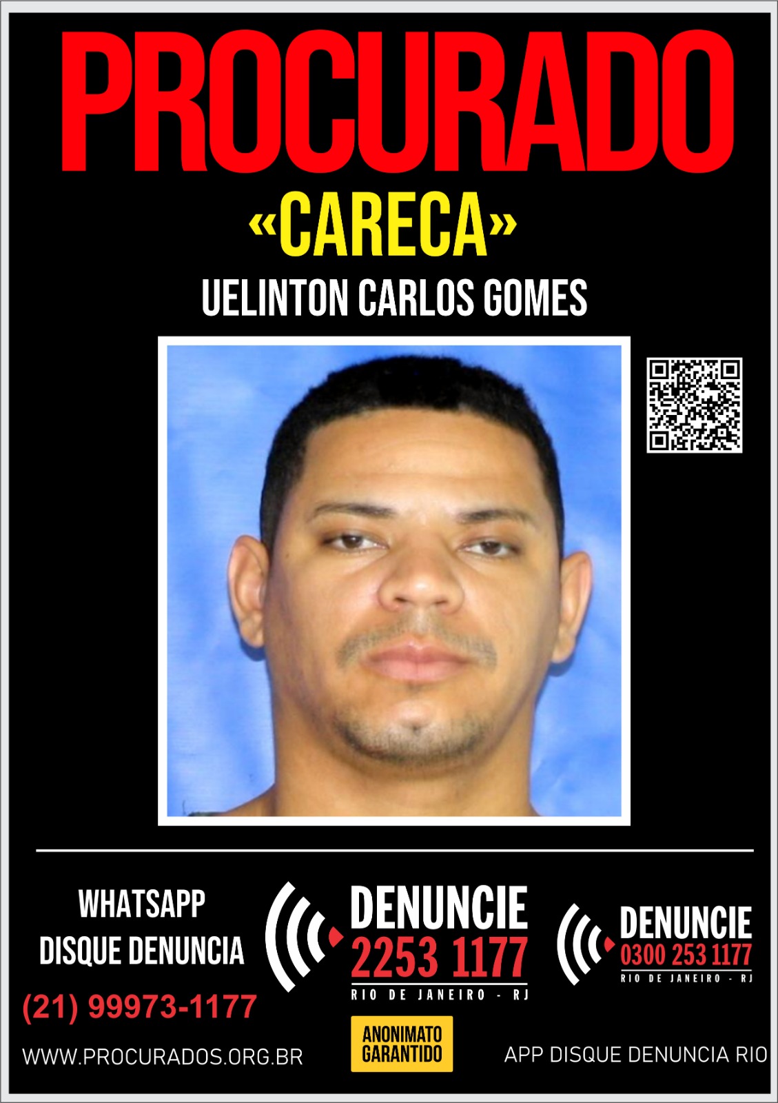 O Disque Denúncia divulgou um cartaz em busca de informações sobre a localização de Uelinton Carlos Gomes, conhecido como “Careca”, de 32 anos.