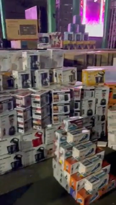 Nas imagens é possível ver centenas de caixas ,com liquidificadores, televisores , sanduicheiras, micro-ondas e outros diversos equipamentos eletrônicos e até mesmo algumas motos.