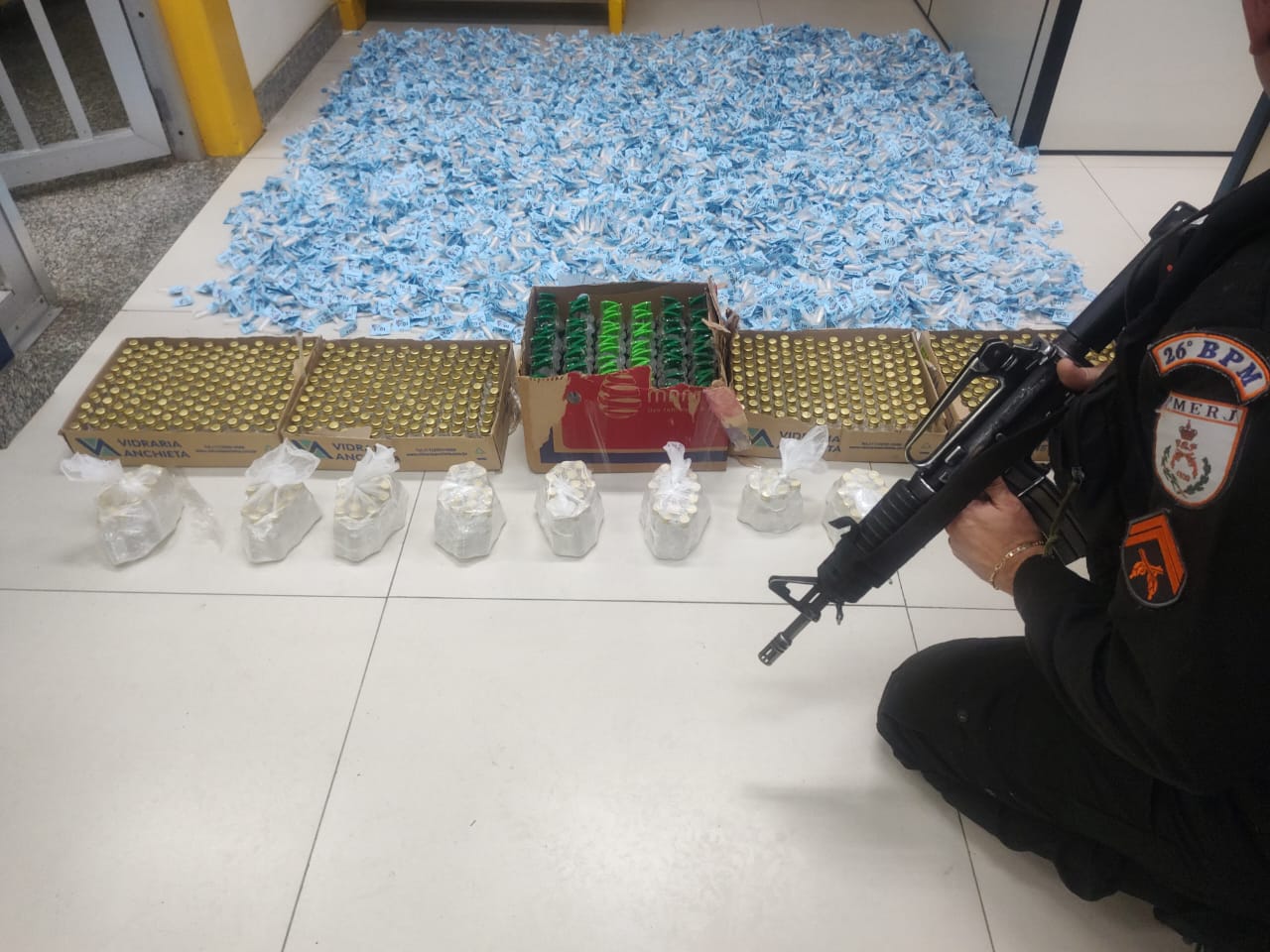 Os policiais identificaram um carro em atitude suspeita e tentaram realizar a abordagem, mas o motorista tentou escapar das equipes. Ele colidiu com uma viatura durante a interceptação. Na inspeção, encontraram 6.720 pinos de cocaína, 699 frascos de loló e 120 frascos de lança-perfume.