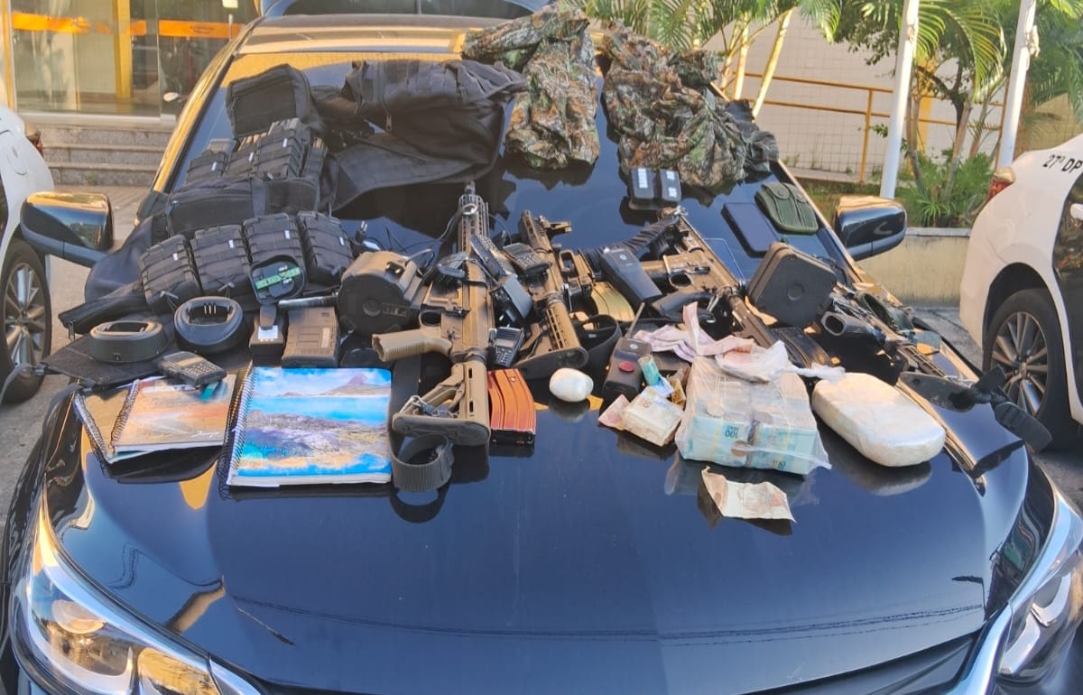 A PRF informou que dentro do veículo, a equipe apreendeu um arsenal impressionante: 4 fuzis Colt Canadá (3 de calibre 5.56 e 1 de calibre 7.62), 19 carregadores (incluindo alguns do tipo “caracol”), quase R$ 50 mil em espécie, 1.100 gramas de cocaína, 93,5 gramas de haxixe, 10,5 gramas de maconha, 11 rádios, 4 telefones celulares e 450 munições de vários calibres.