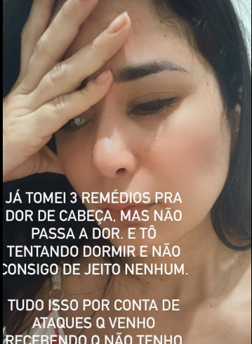 Durante a madrugada desta sexta-feira (7), a influenciadora disse que não estava conseguindo dormir por causa das ameaças. “Já tomei três remédios pra dor de cabeça, mas não passa a dor. E tô tentando dormir e não consigo de jeito nenhum. Tudo isso por conta de ataques que venho recebendo que não tenho culpa nenhuma. Muito chato isso”, disse.