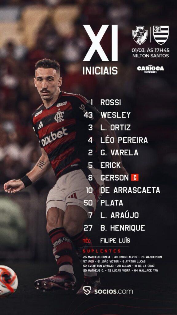 O Flamengo vai com time misto para enfrentar o Vasco neste sábado (1º), pelas semifinais do Campeonato Carioca. O técnico Filipe Luis resolveu poupar boa parte do time titular, enquanto o Vasco, de Fábio Crille vem com força máxima.