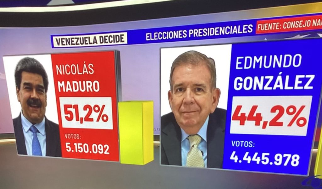 O resultado das eleições foram divulgados durante a madrugada. Segundo o CNE, Maduro teve 5.150.092 votos, o equivalente a 51,2% dos votos apurados. Conzáles conquistou 4.445.978 votos, o que representa 44,2% das urnas apuradas.