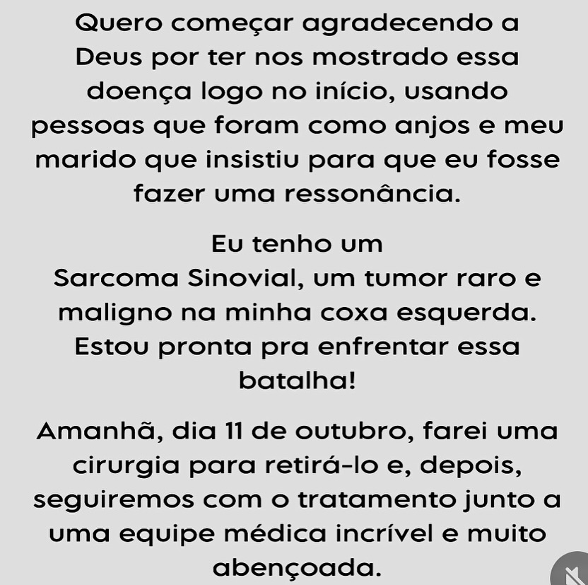 Vera Viel descobriu o tumor após notar um nódulo na perna esquerda, o que a levou a procurar atendimento médico. O diagnóstico de Sarcoma Sinovial foi confirmado pouco depois. Conhecido por seu crescimento rápido e agressivo, este tipo de câncer requer intervenção médica rápida. Rodrigo Faro compartilhou imagens de Vera internada e aguardando a cirurgia como forma de demonstrar apoio e oferecer informações aos seguidores e fãs do casal.