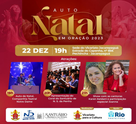 O Vicariato Episcopal para Cultura da Arquidiocese do Rio de Janeiro promove no dia 22 de dezembro à partir das 19h o “Auto Natal em Oração”, com o objetivo de iluminar a cidade com o espírito festivo do Natal em comunhão com o Ano da Oração, com o lema “Senhor, ensina-nos a orar” (Lc 11, 1).