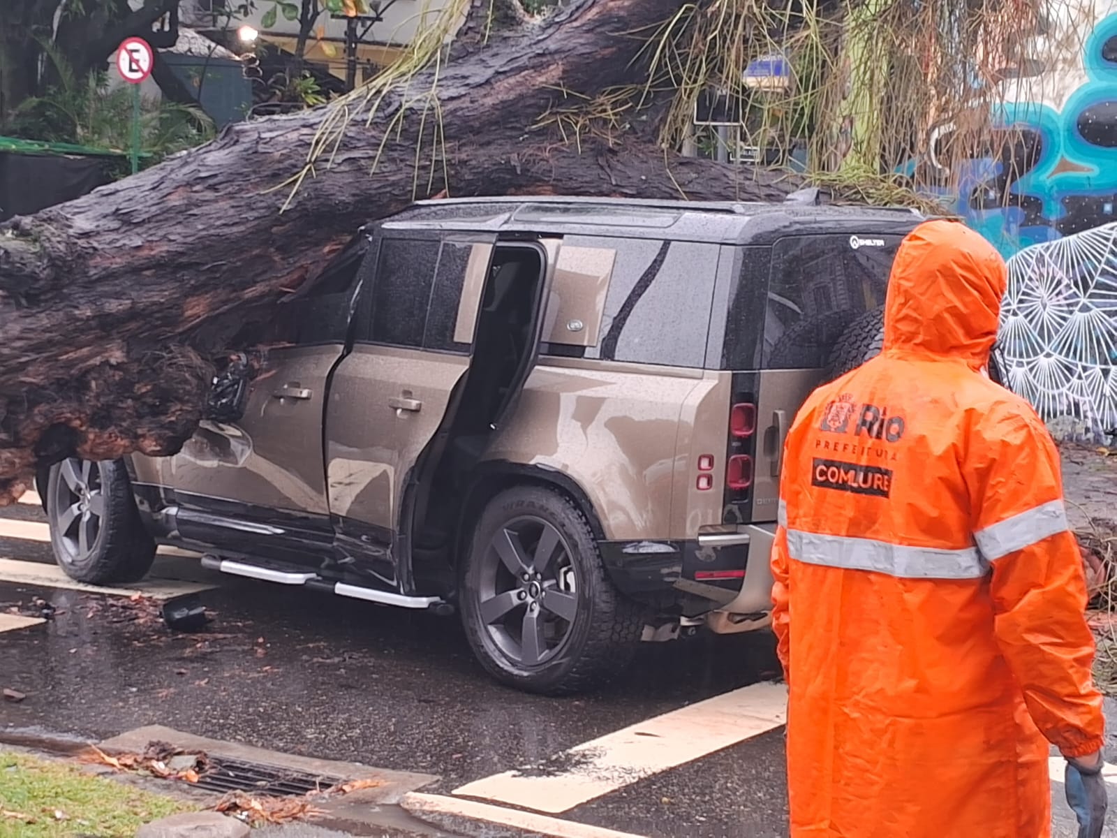 Motorista escapa com ferimento leve após árvore gigantesca cair sobre seu carro no Jardim Botânico, na Zona Sul do Rio