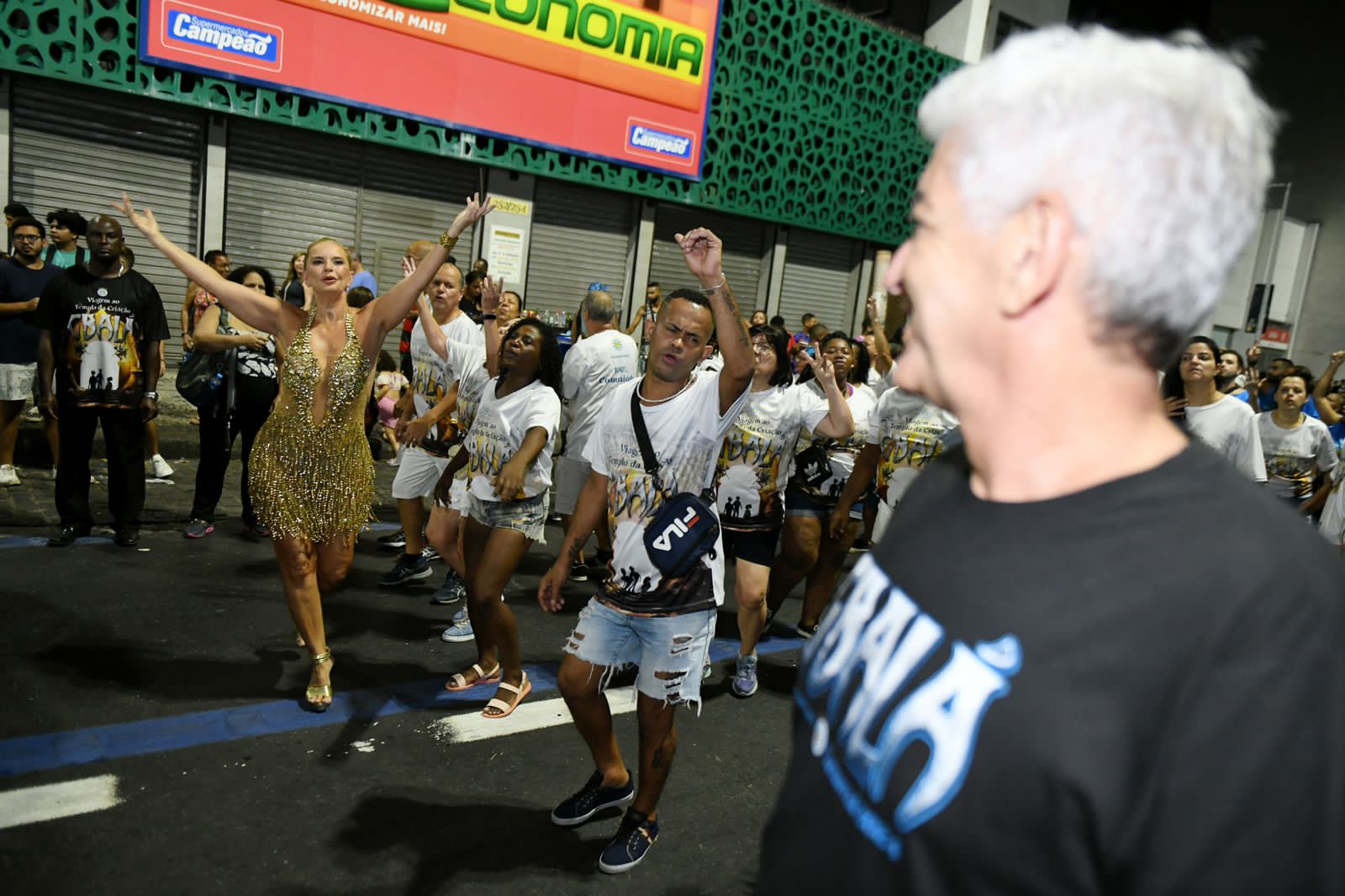 Sobre os olhos atentos do namorado, o empresário Otto Blanco, a “Vovó Musa” da Vila surgiu deslumbrante em um vestido dourado de franjas de strass e pedrarias: