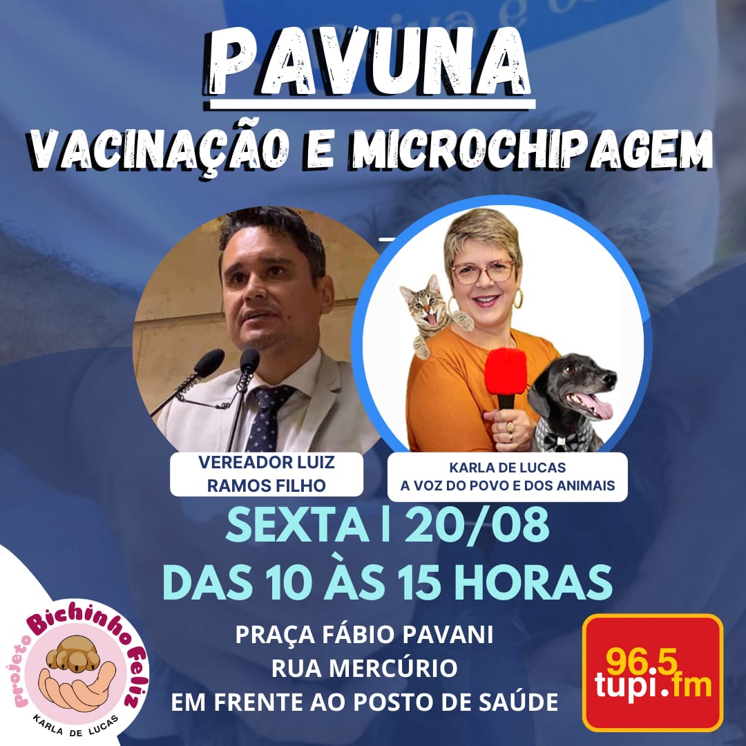 Nesta sexta-feira (20), o projeto Bichinho Feliz realiza, das 10h às 15h, uma campanha de vacinação contra raiva e microchipagem. O evento acontece na Praça Fábio Pavani, na Pavuna, na Zona Norte do Rio.
