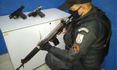 Policiais militares do Comando de Policiamento Ambiental apreenderam duas espingardas, quatro trabucos, um cano de espingarda, 27 cartuchos com munição intactos, 31 cartuchos deflagrados e um...